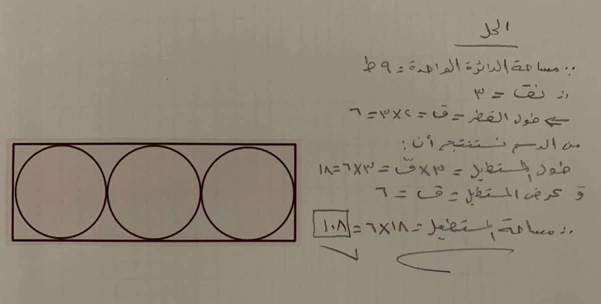 حل مسائل القدرات Su Twitter سؤال اليوم في الشكل المرفق إذا علمت أن الدوائر الثلاثة متطابقة و مساحة كل منها ٩ط فما مساحة المستطيل