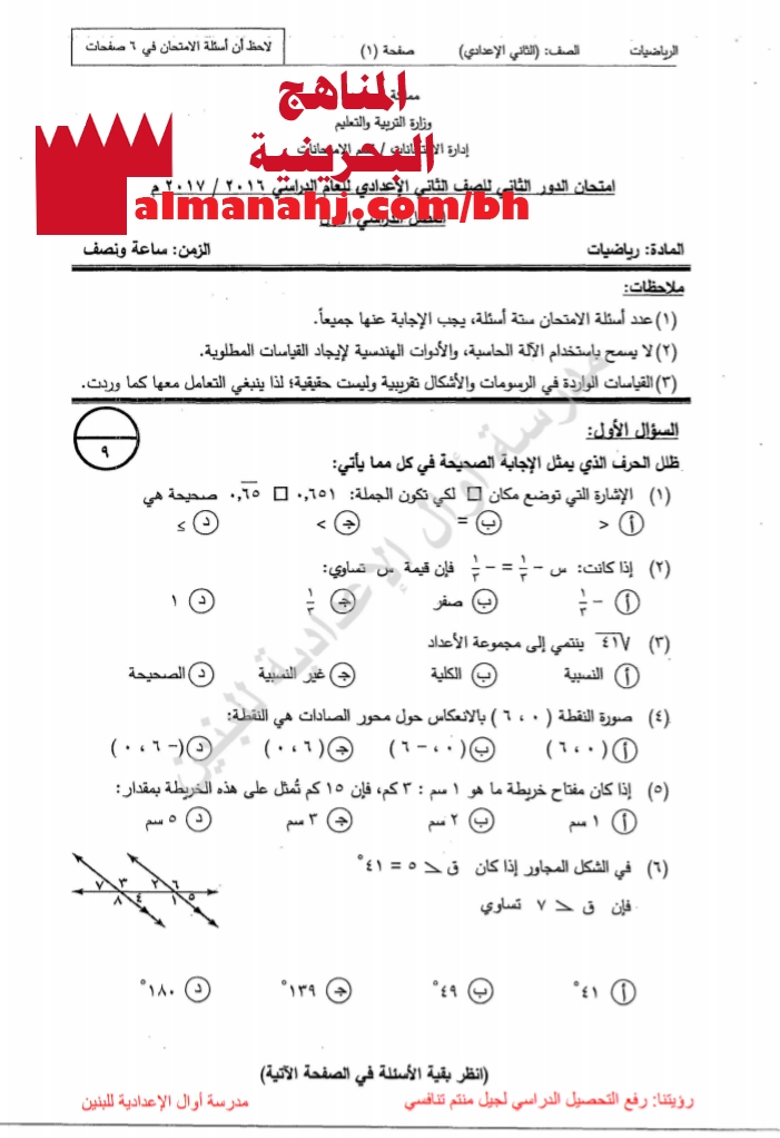 أسئلة امتحان الدور الثاني الصف الثامن رياضيات الفصل الأول المناهج البحرينية