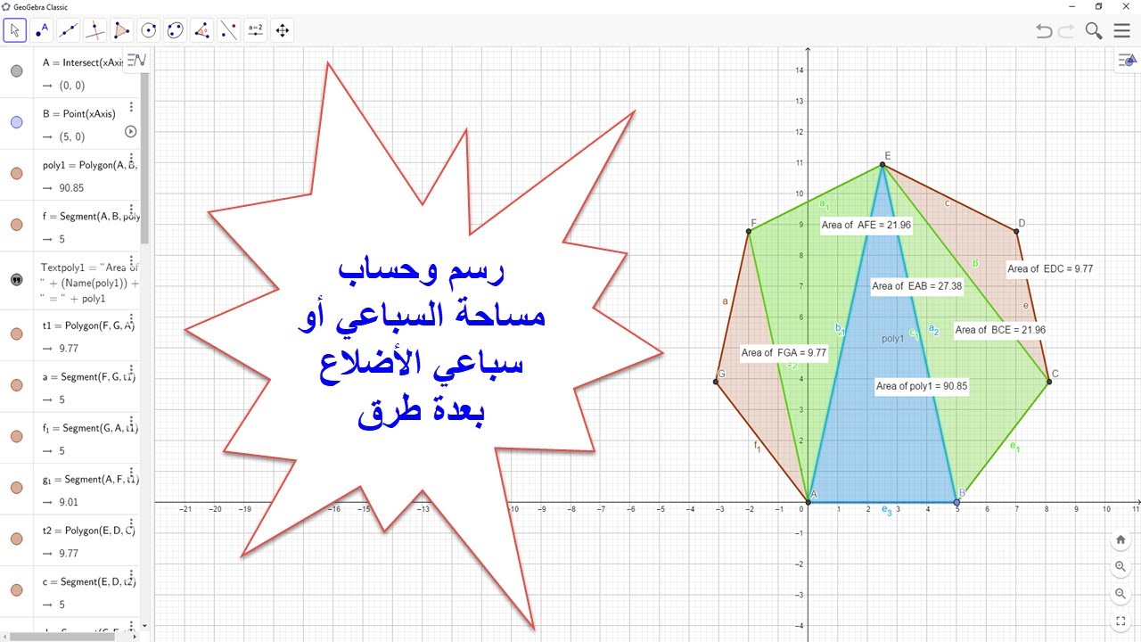 درس 16 كيفية رسم وحساب المساحة لشكل سباعي الأضلاع السباعي المسبع منتظم برنامج جيوجبرا شرح عربي Youtube