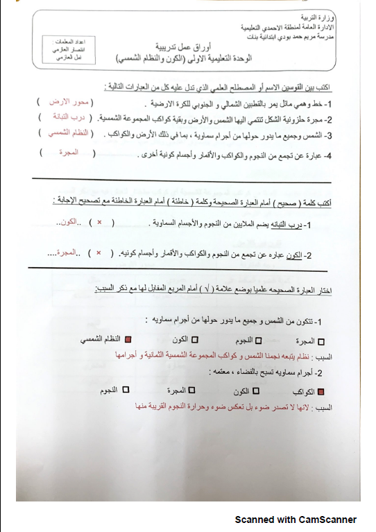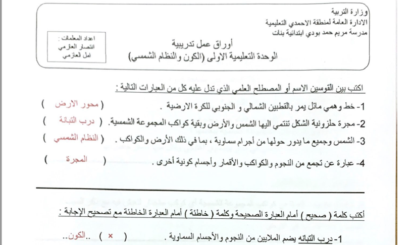 مذكرة محلولة علوم خامس وحدة الكون والنظام الشمسي أ شيماء العنزي مدرستي الكويتية
