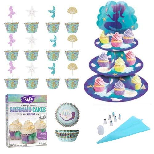 مجموعة تزيين الكب كيك I 3 طبقات حامل برج I 12 عروس البحر لتزيين الكعك و12 لفافة I 24 بطانات كب كيك على شكل حورية البحر I 24 بطانات كوب كيك فاخرة