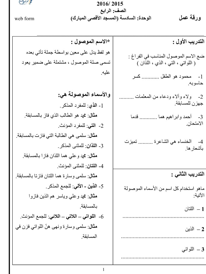 نموذج اختبار في درس الارض المباركة وأوراق عمل الأسماء الموصولة لمادة للغة العربية للصف الرابع الفصل الأول منتديات صقر الجنوب