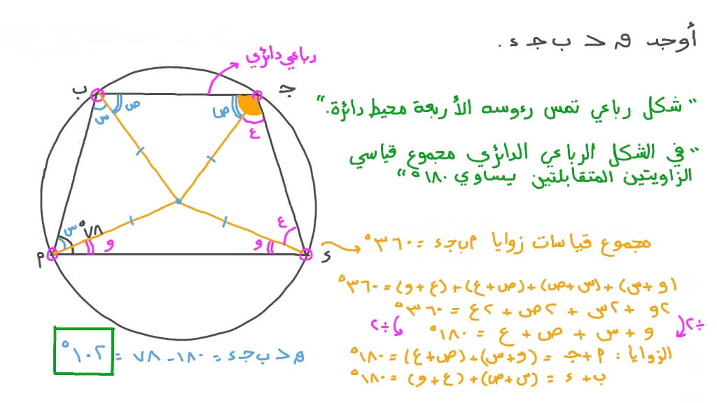فيديو السؤال إيجاد قياس زاوية في شكل رباعي دائري بمعلومية قياس الزاوية المقاب لة لها