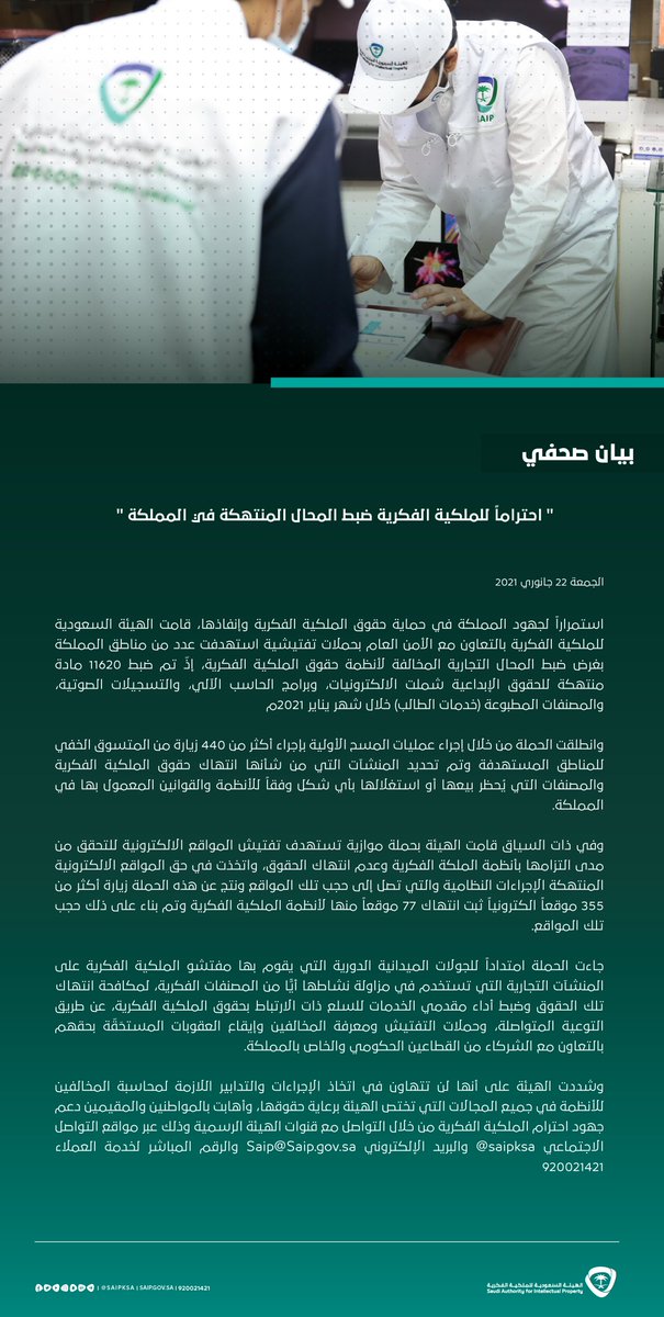 ضبط 11620 مادة و77 موقعا انتهك الملكية الفكرية خلال شهر يناير المدينة