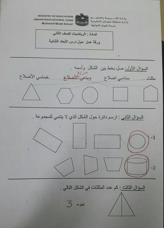 أوراق عمل الأشكال الهندسية رياضيات صف ثاني فصل ثالث مدرستي الامارتية