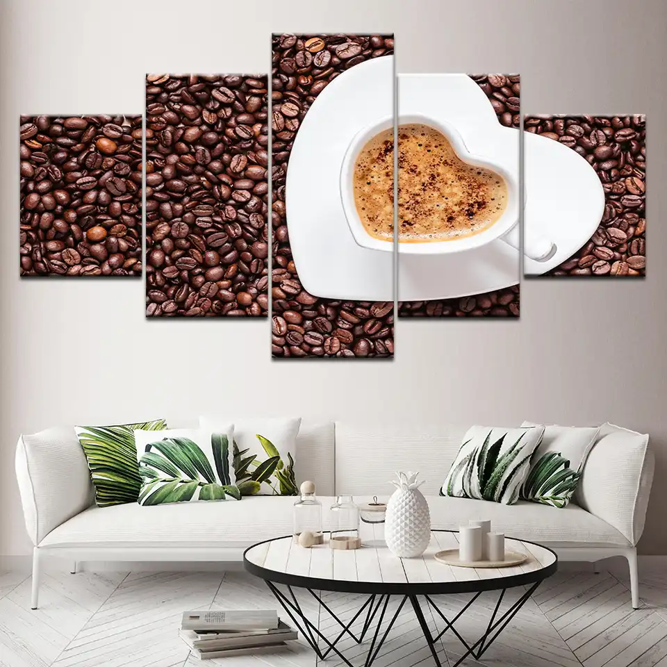 قماش اللوحة القلب على شكل كوب من القهوة 5 أجزاء وحدات خلفيات المشارك الإطار طباعة لغرفة المعيشة ديكور المنزل الرسم والخط Aliexpress