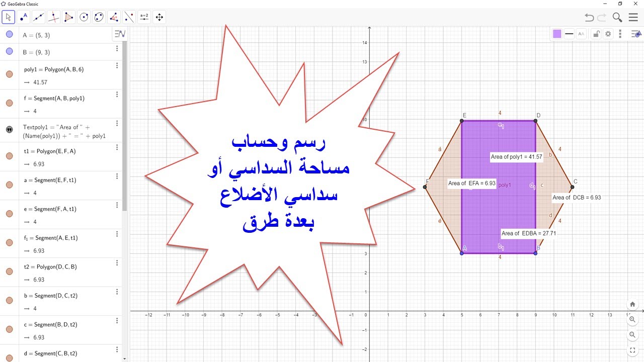 درس 15 كيفية رسم وحساب المساحة لشكل سداسي الأضلاع السداسي المسدس منتظم برنامج جيوجبرا شرح عربي Youtube