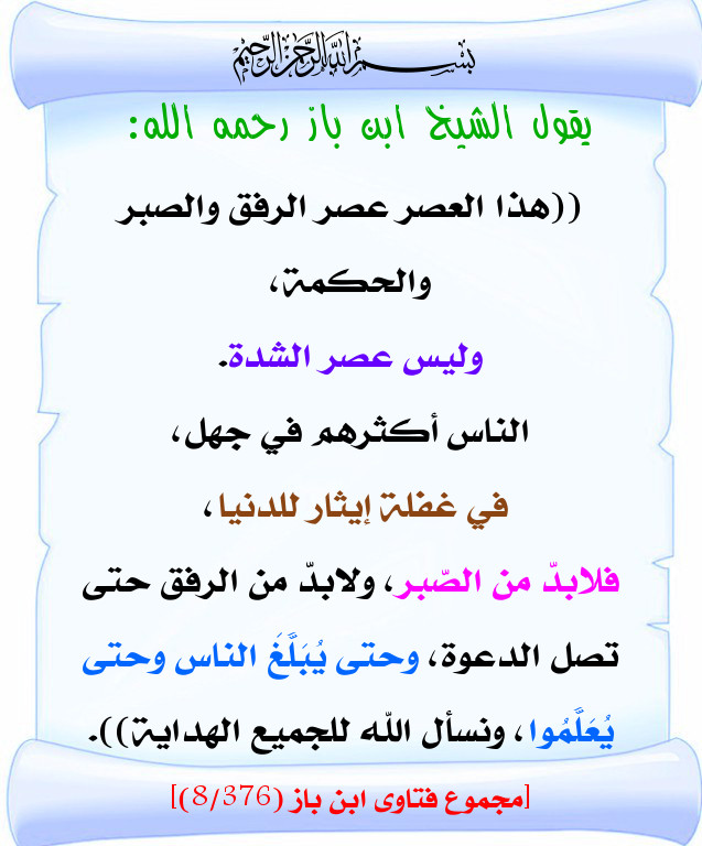 قال ابن باز رحمه الله هذا العصر عصر الرفق والصبر والحكمة وليس عصر بطاقة دعوية منتديات الإمام الآجري