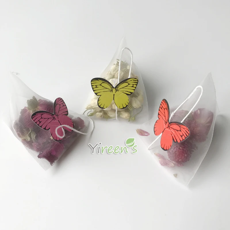 بطاقة على شكل فراشة ملونة 1000 قطعة 58x70 مللي متر أكياس شاي من النيلون الفارغة أكياس ترشيح شفافة على شكل هرم مرشحات شاي من النيلون للاستعمال لمرة واحدة Filter Bag Tag Tagbag