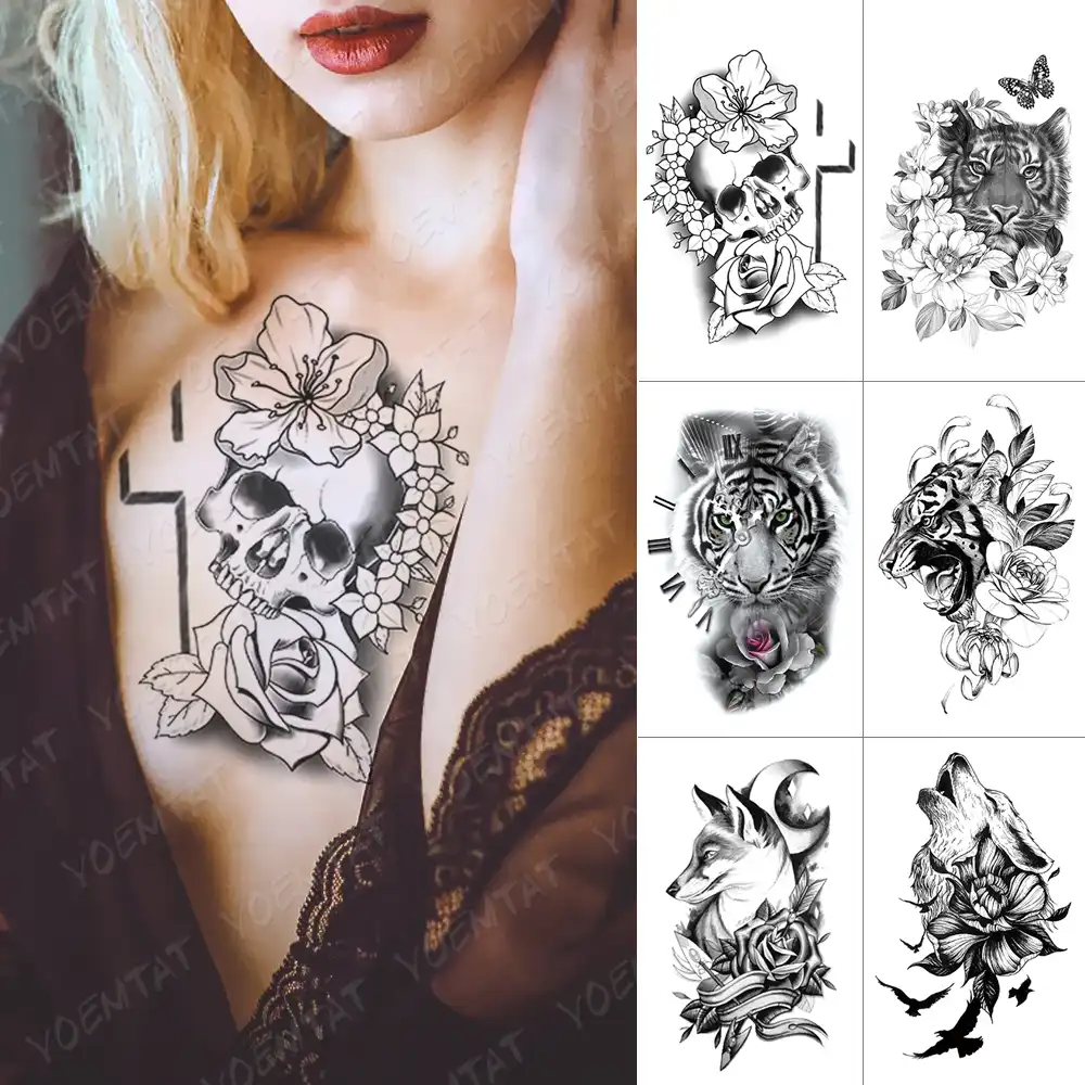 ملصق تاتو مؤقت مضاد للمياه تاتو على شكل جمجمة متقاطعة وردية تاتو على شكل نمر وولف ذراع فني لنقل المياه تاتو مزيف للنساء والرجال وشم مؤقت Aliexpress