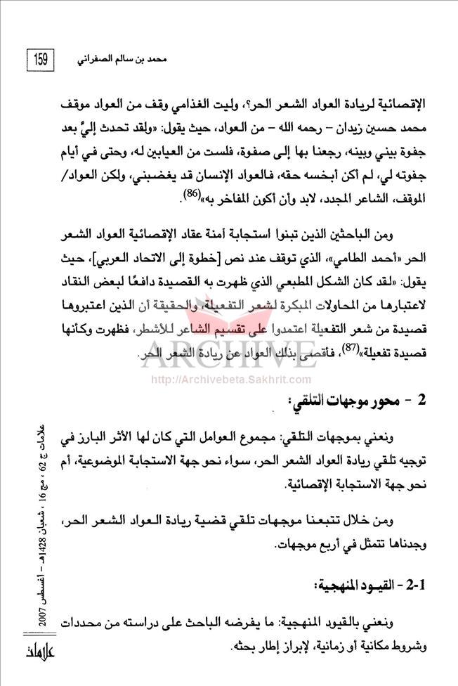 الأرشيف علامات في النقد العدد 62 تاريخ الإصدار 1 أغسطس 2007 مقالة ريادة العواد للشعر وتلقيها في الدراسات النقدية