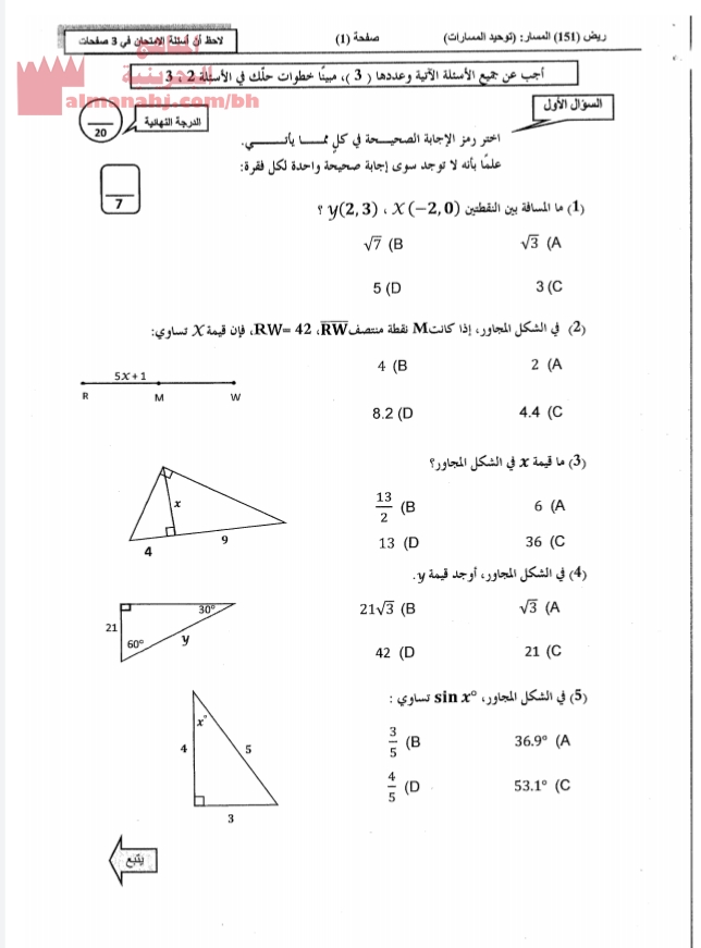 أسئلة امتحان منتصف مقرر ريض 151 نموذج 1 الصف العاشر رياضيات الفصل الأول المناهج البحرينية