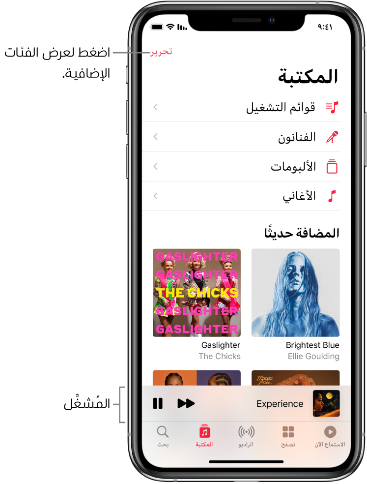 عرض الألبومات وقوائم التشغيل والمزيد في تطبيق الموسيقى على الـ Iphone الدعم Apple
